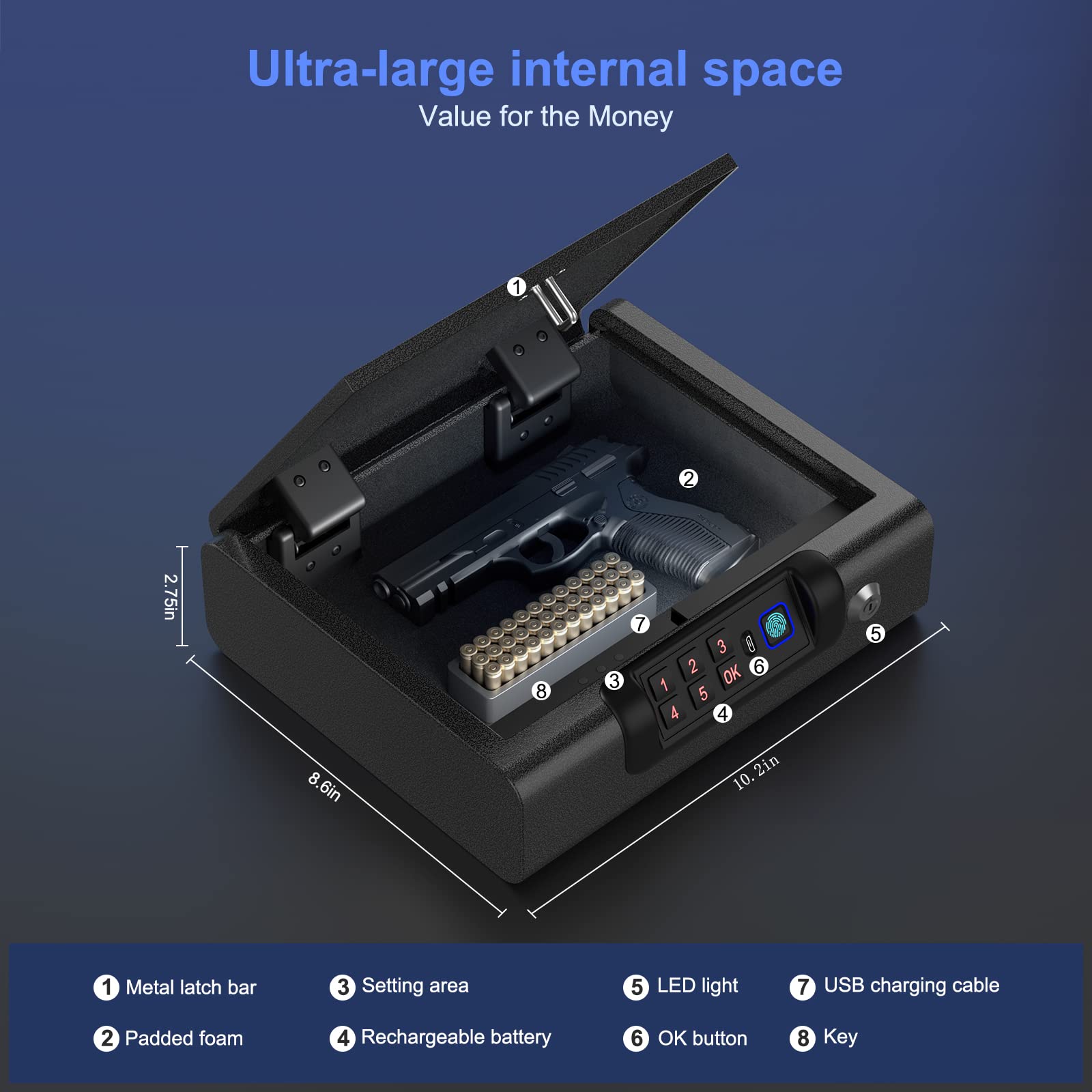 - BIOMETRIC ACCESS: The pistol safe is a biometric access/PIN access portable metal . gun safes for pistols is ideal for Pistols, cash and other valuable items. Top of the line biometric chips brings high security and access control system together and makes it safe and user friendly