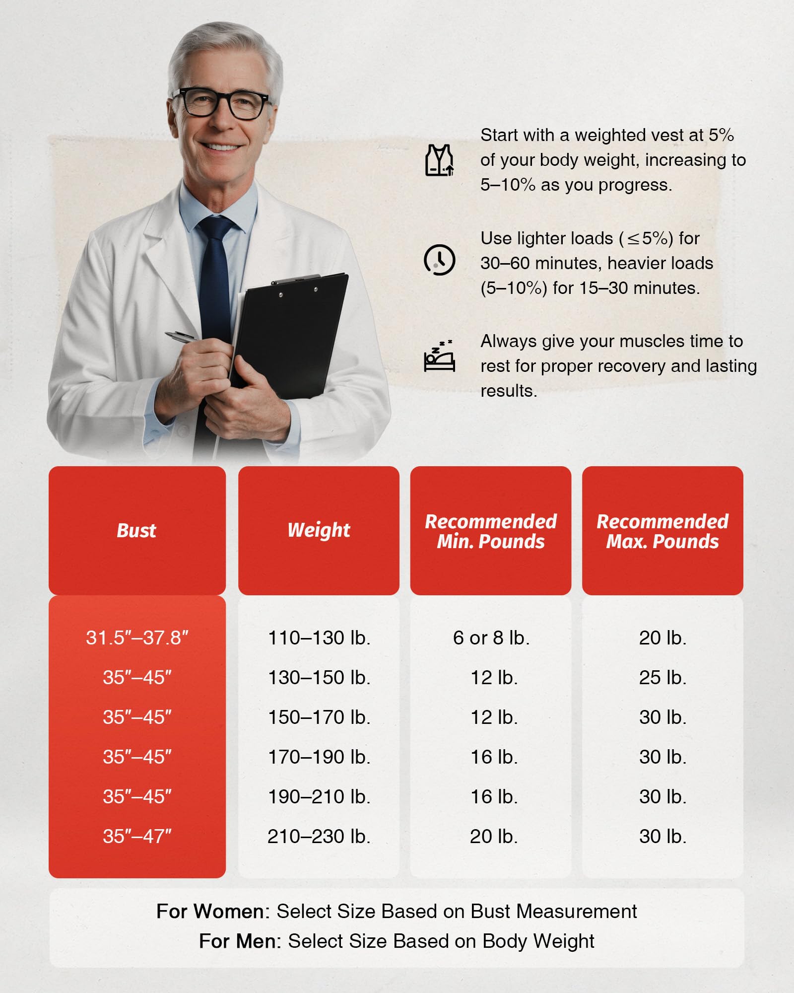 - One Size Fits Most: Our weighted vest for women and men is equipped with adjustable buckle straps that offer a snug fit for chest sizes between 31.5" and 45". No matter your body type, it stays securely in place as you work to improve your strength